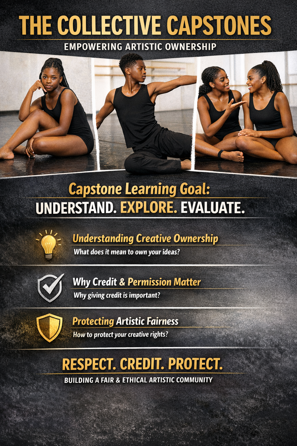 In this advanced unit, scholars will evaluate the concept of intellectual property and understand why creative ownership is essential for dancers. They will explore how protecting their ideas, choreography, and artistic work helps them maintain control over their creations. Scholars will also examine the financial side of creative ownership—learning how dancers earn income from their work, why copyright and licensing matter, and how protecting their creativity supports long‑term economic stability in the arts.
